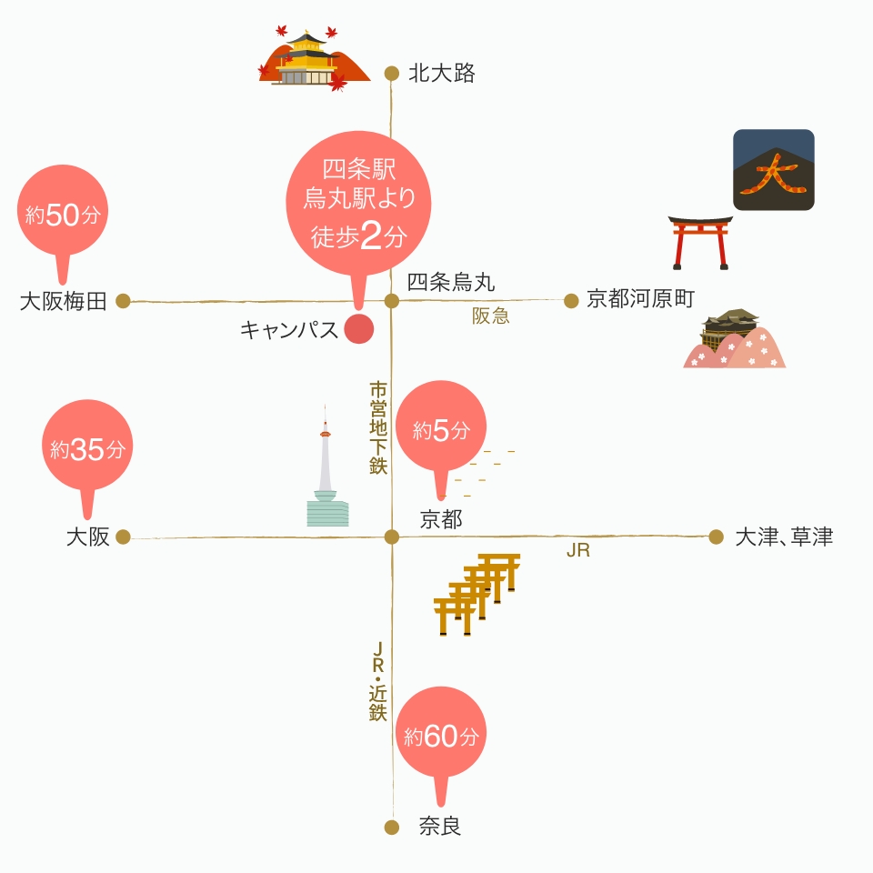 Iketanのキャンパスは京都の中心地、四条烏丸にあります。通学に便利なだけでなく、日本の文化を身近に感じられる環境です。